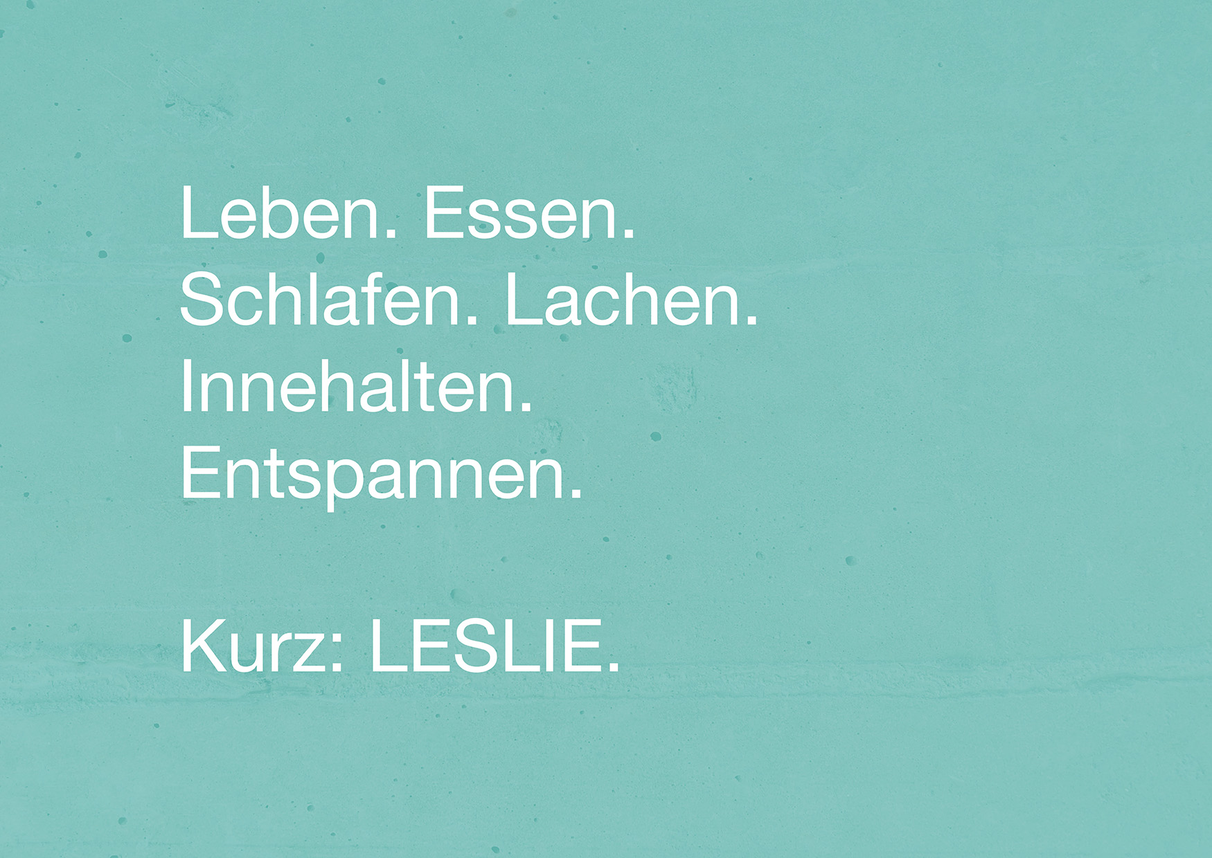 Inspiriert von all dem, was ein Zuhause ausmacht, entstand der Name LESLIE: Leben. Essen. Schlafen. Lachen. Innehalten. Entspannen. Zusammen mit dem Logo bildet er den Kern der Markenidentität und trägt die Idee des Projekts nach außen – klar, emotional und unverwechselbar.