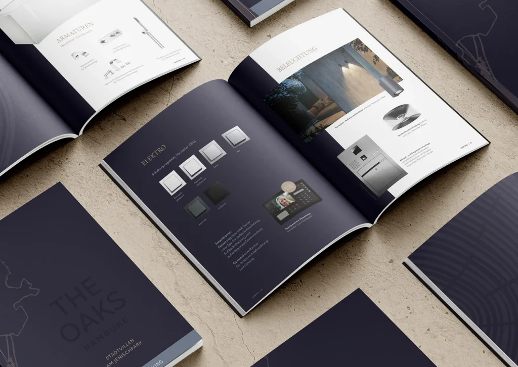 / Elegance turned into identity. THE OAKS – eine Markenwelt für elf Stadtvillen. „Storms make the oak grow deeper roots.“ – ein Leitsatz, der die Idee von THE OAKS prägt. Elf luxuriöse Stadtvillen in Hamburgs schönster Umgebung, getragen von dem Versprechen von Beständigkeit und Eleganz. Unsere Aufgabe: dieses Fundament in ein durchgängiges Design zu übersetzen. Vom Logo über Farbwelt und Typografie bis zu Exposé, Website und Grundrissen – jedes Detail greift ineinander und macht die Werte des Projekts spürbar. Denn es sind die kleinen Details, die ein Zuhause genauso wie ein Design besonders machen. Kunde Deutsche Immobilien Entwicklungs GmbH Leistungen XXX Zur Website Stärke, die sichtbar wird – durch ein Muster, das Zeit und Beständigkeit verkörpert. Design inspired by nature’s growth. Branding bis ins letzte Detail. Bei THE OAKS haben wir nicht nur das große Ganze gestaltet, sondern jedes Detail der Kommunikation übernommen. Website, Exposé, Grundrisse, Preislisten und selbst die Reservierungsbestätigungen tragen die Handschrift eines einheitlichen Designs. So entsteht ein durchgängiges Erlebnis, das die Werte von Eleganz und Qualität in jedem Kontaktpunkt sichtbar macht. / Weitere Projekte