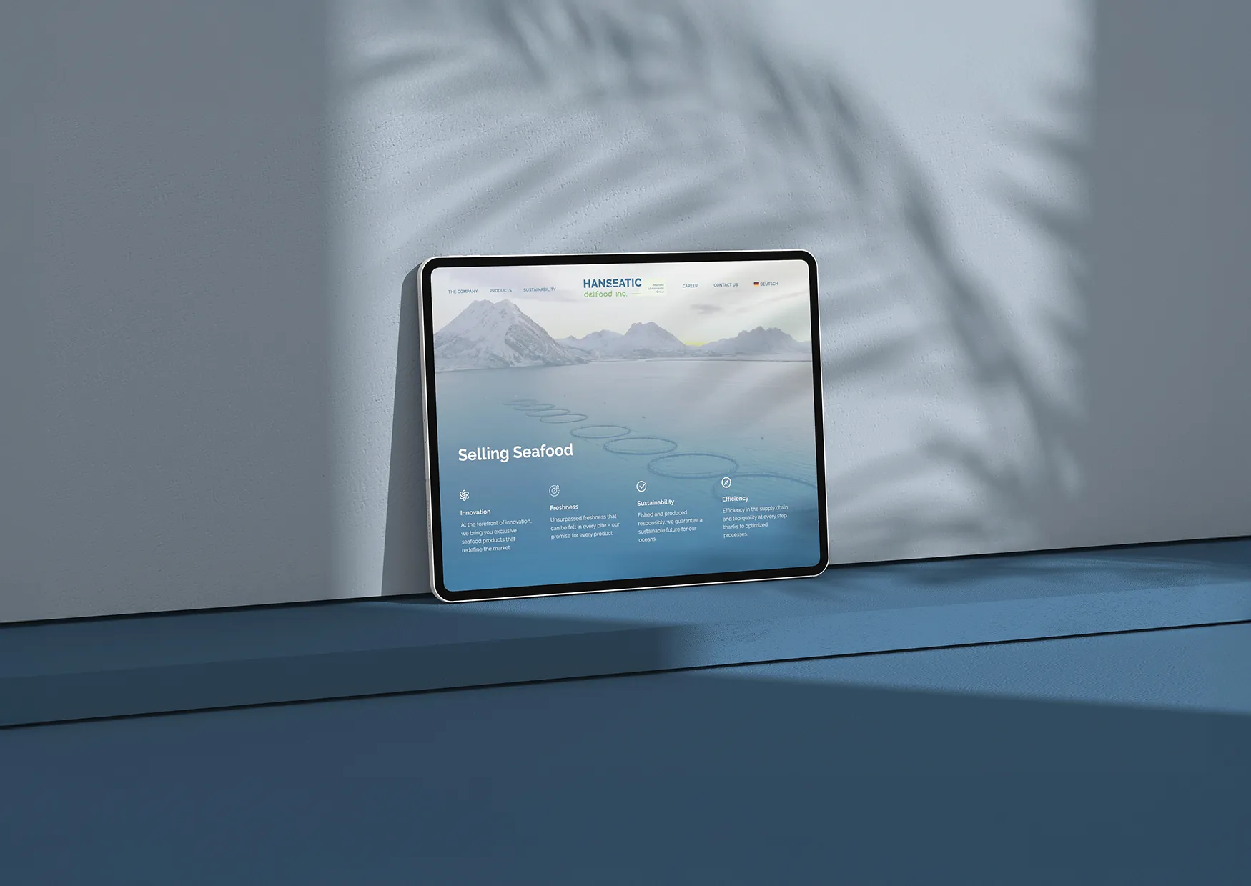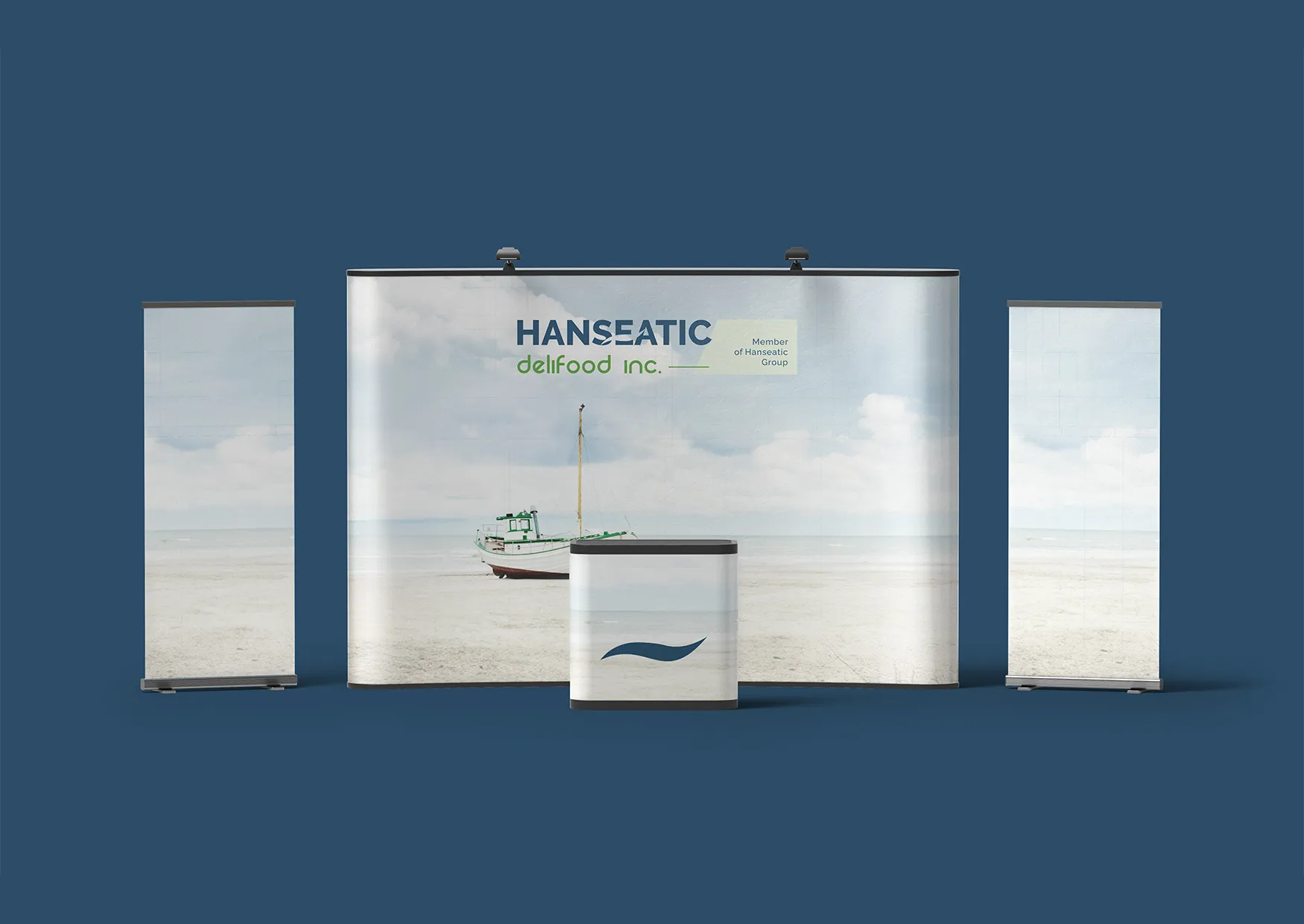Vom digitalen Look über Geschäftsausstattung bis hin zum Messestand: Für Hanseatic Delifood haben wir eine Identität geschaffen, die die Marke international trägt. Blau, moody und voller Bewegung erinnert das Design an die Atmosphäre norwegischer Fjorde – und bringt die Leidenschaft für Fisch visuell auf den Punkt.