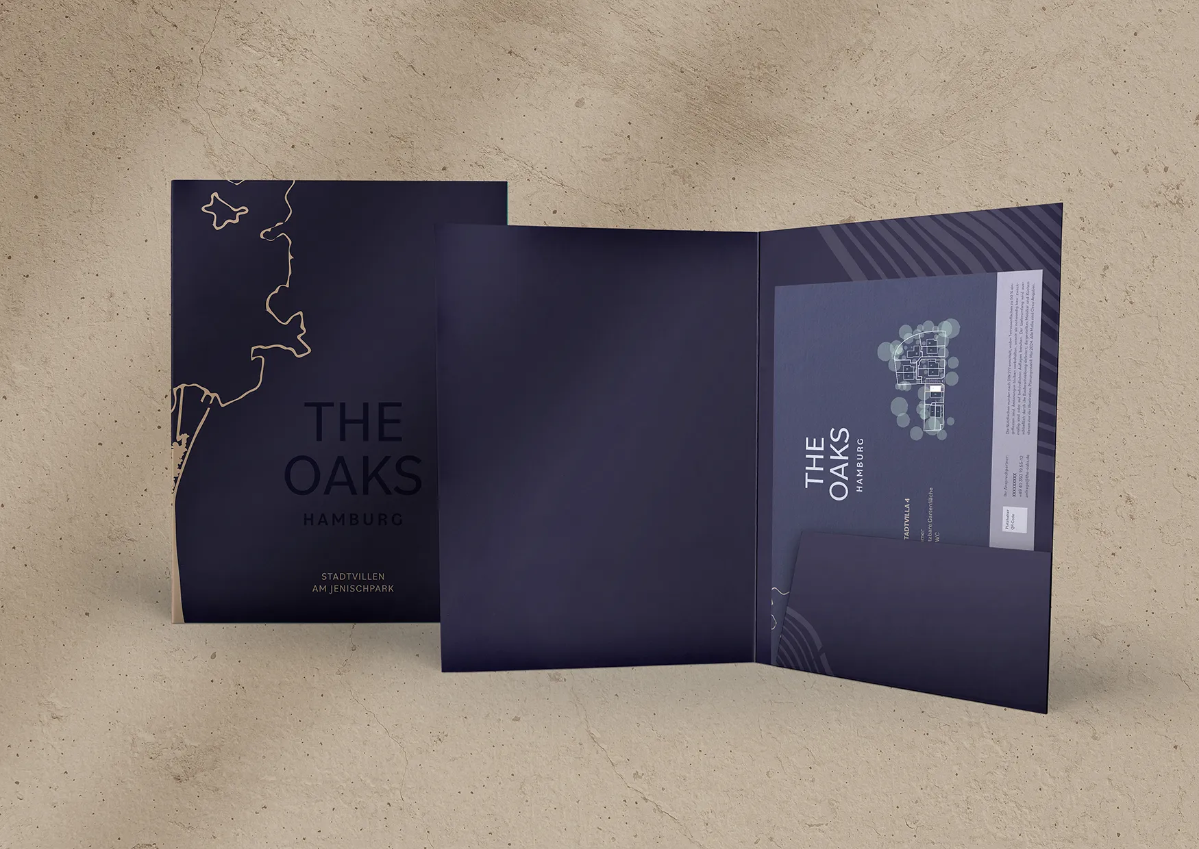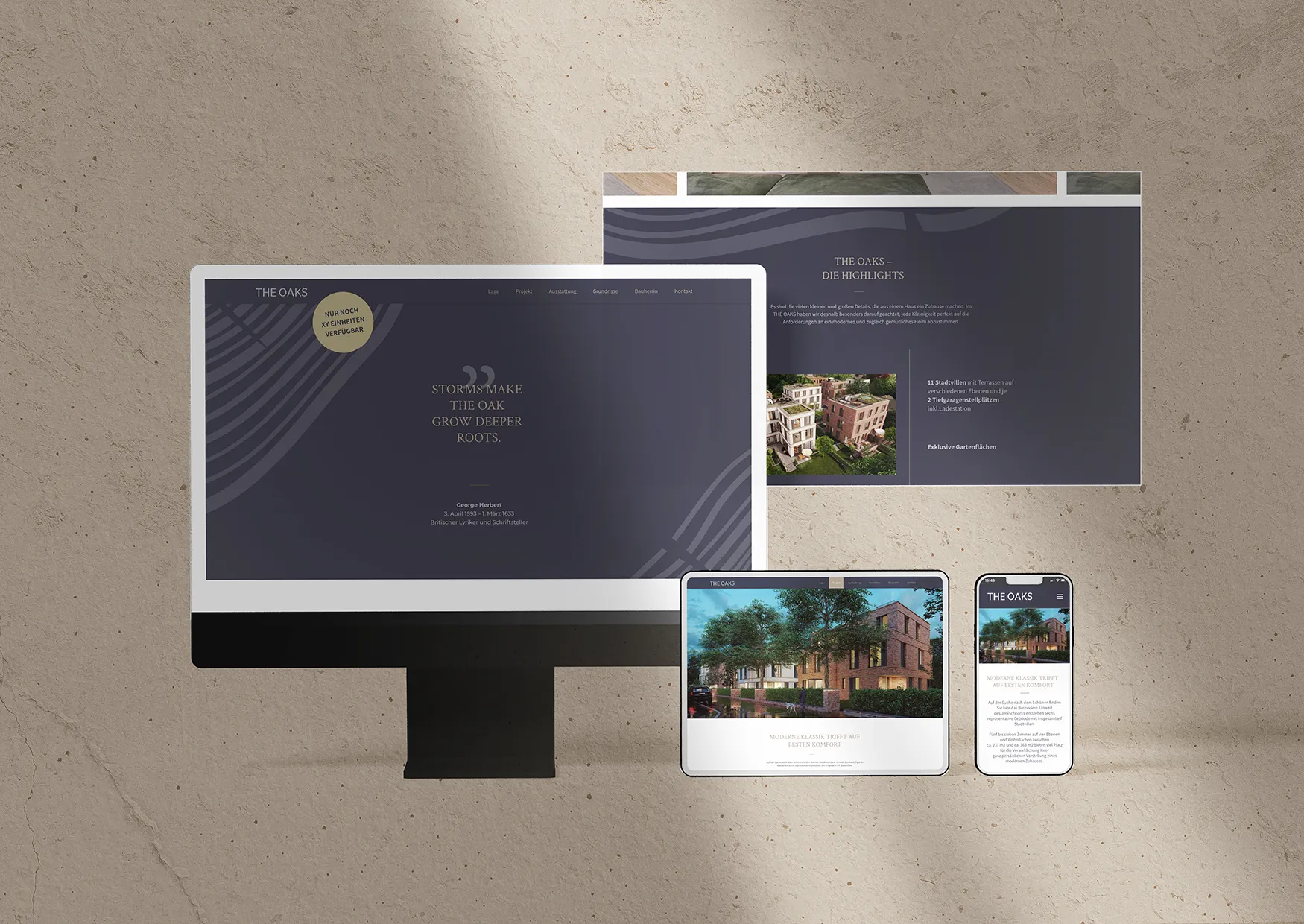 „Storms make the oak grow deeper roots.“ – ein Leitsatz, der die Idee von THE OAKS prägt. Elf luxuriöse Stadtvillen in Hamburgs schönster Umgebung, getragen von dem Versprechen von Beständigkeit und Eleganz. Unsere Aufgabe: dieses Fundament in ein durchgängiges Design zu übersetzen. Vom Logo über Farbwelt und Typografie bis zu Exposé, Website und Grundrissen – jedes Detail greift ineinander und macht die Werte des Projekts spürbar. Denn es sind die kleinen Details, die ein Zuhause genauso wie ein Design besonders machen.